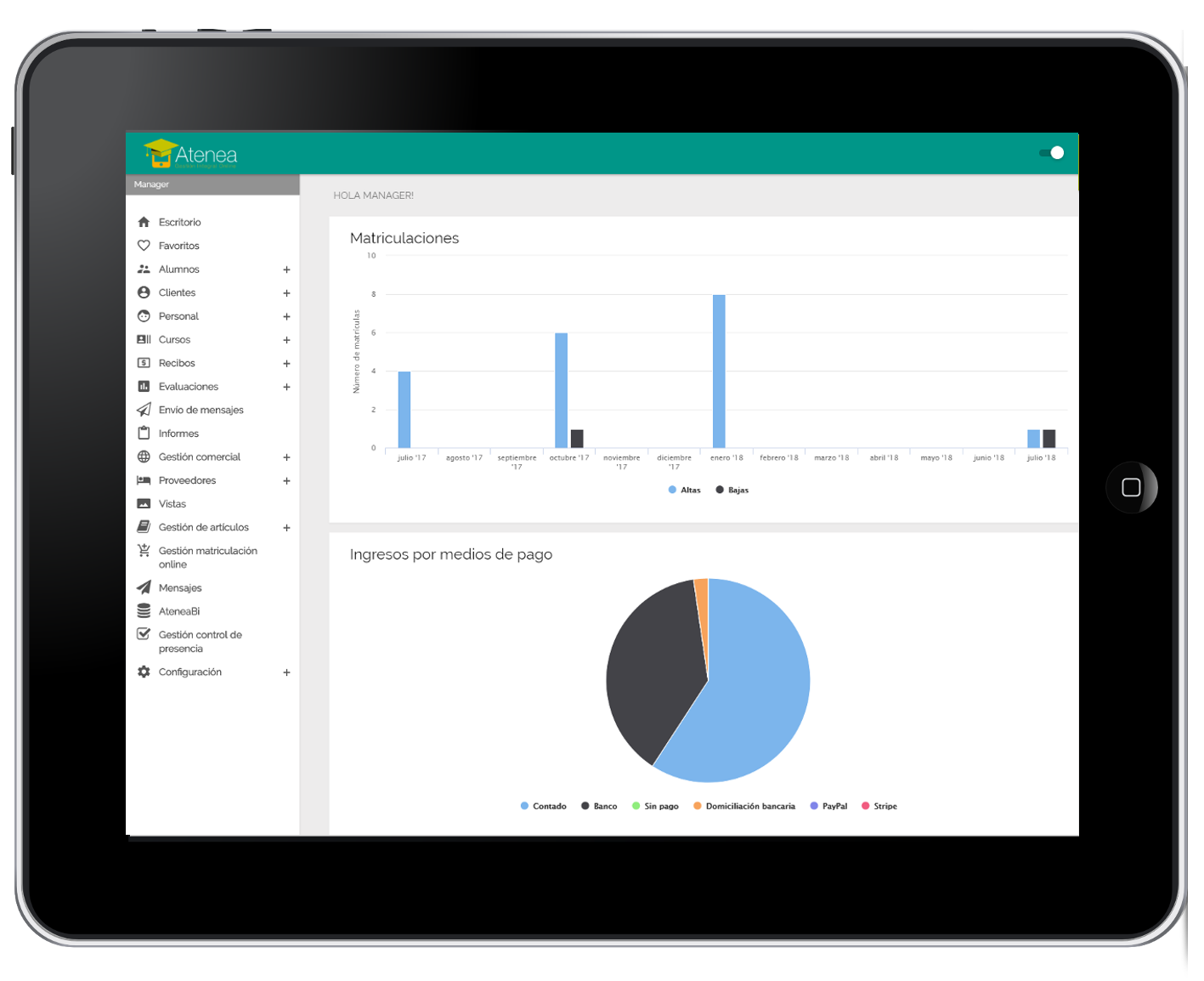 Optimiza la gestión y toma mejores decisiones Desde matriculaciones y facturación hasta asistencia y evaluaciones, Atenea digitaliza todos los procesos clave de tu academia. Genera informes detallados, gestiona pagos y accede a estadísticas en tiempo real.